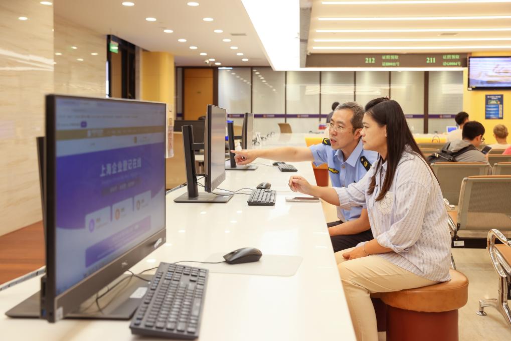 上海市市場監(jiān)督管理局登記注冊處一級主任科員施毅(左一)幫助企業(yè)工作人員在“上海企業(yè)登記在線”平臺上辦理登記業(yè)務(wù)。